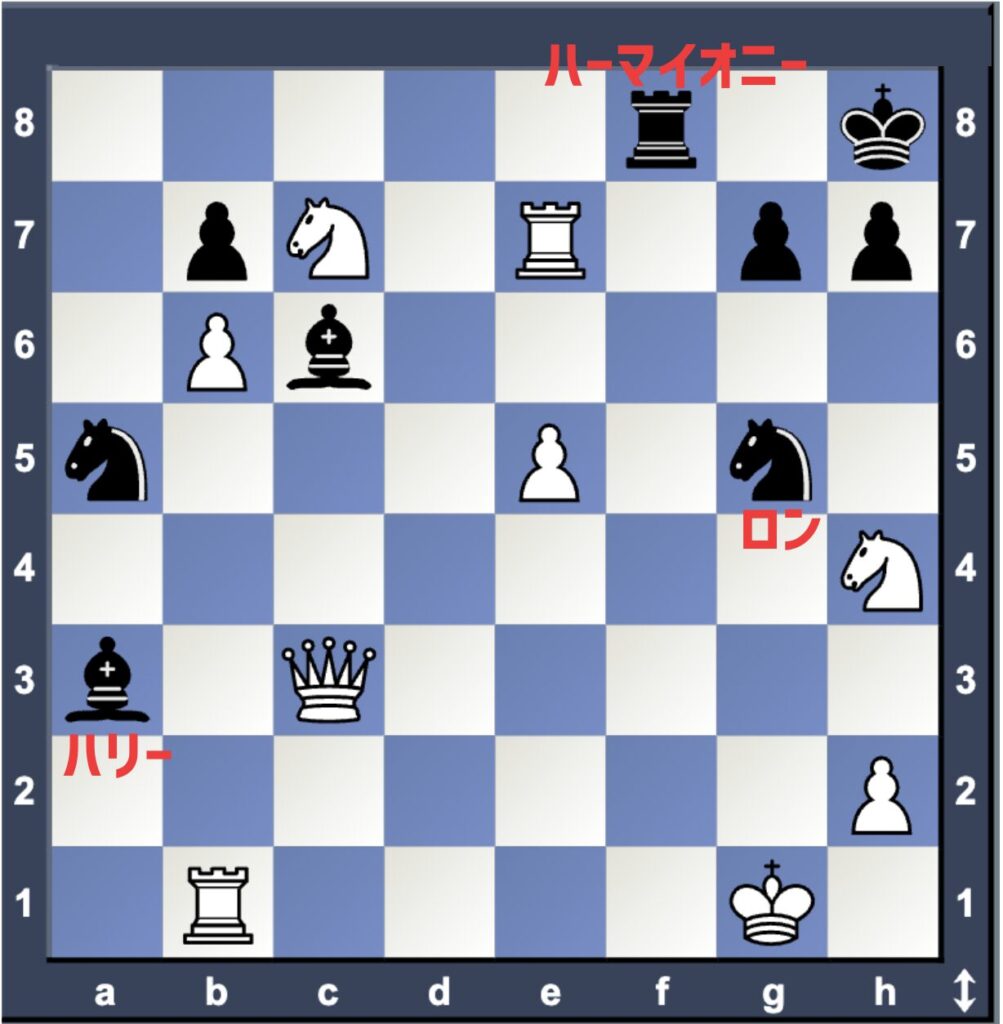 映画だとここでロンが “Knight to H3!” と言って、次の流れでチェックメイトになります。